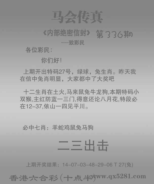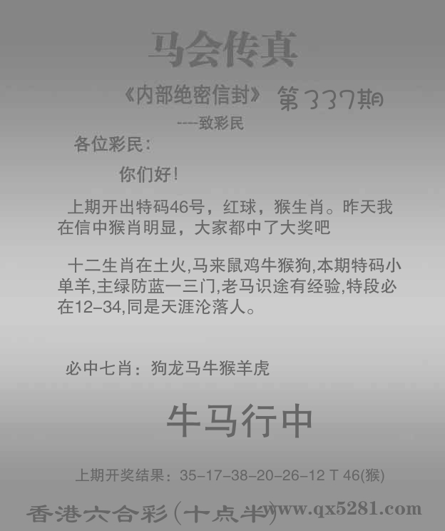 | 337期: ⑥肖 | 牛羊鼠蛇兔猴 | 狗32中 |