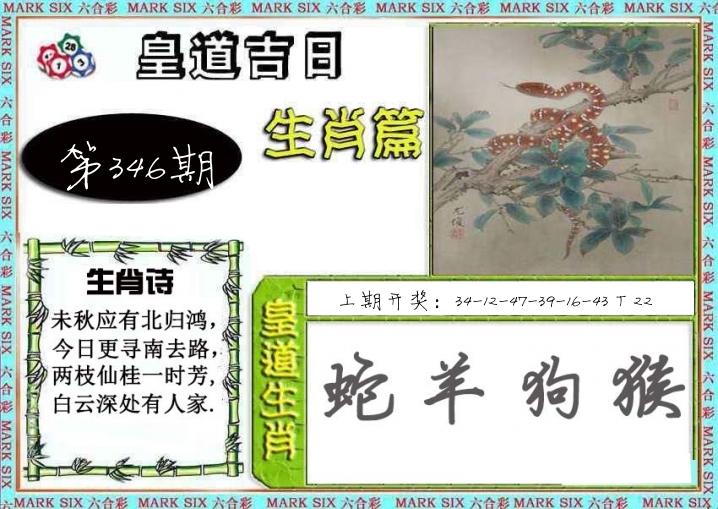 | 344期: ⑥肖 | 牛虎蛇鸡兔猪 | 蛇37中 |